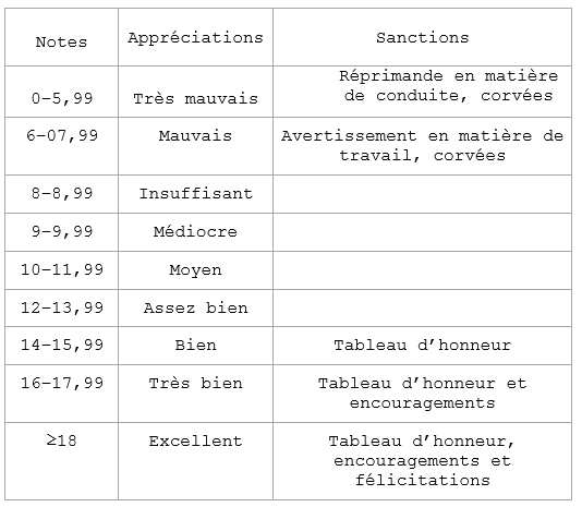 Selon la lettre circulaire no. 0016/A/356/MINEDUC/SG/IGP du 23/01/1979, relative au conseil de classe, le tableau ci-dessous énonce les sanctions relatives au travail scolaire et à la conduite des élèves. Aucun élève ne peut tripler une classe quel que soit son âge.