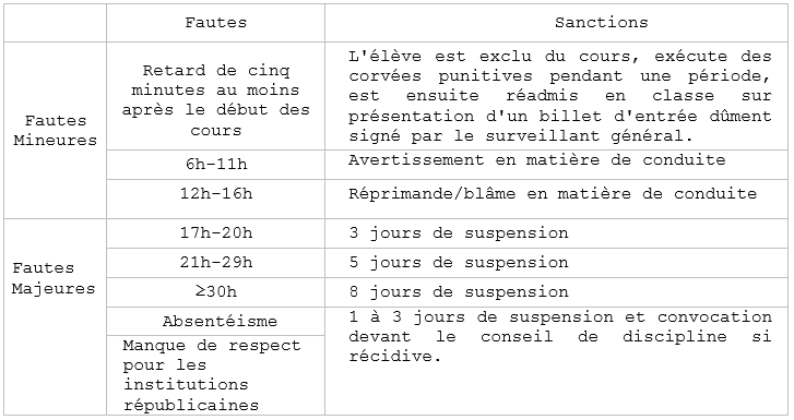 La présence de chaque élève aux activités pédagogiques et aux cérémonies officielles est obligatoire. Toute violation de cette obligation par les élèves entraînera les sanctions disciplinaires suivantes :