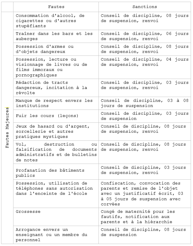 La loi n° 98/004 du 14 avril 1998 portant sur l’orientation scolaire au Cameroun, en son article 36, stipule que les élèves ont l’obligation d’accomplir des tâches afférentes à leurs études. Cela inclut le respect du règlement intérieur de l’établissement ainsi que des dispositions gouvernementales suivantes, actuellement en vigueur:
