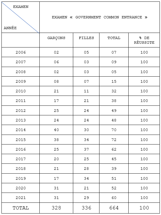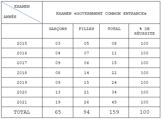 2- NCBS : Résultats à l’examen « Government Common Entrance »