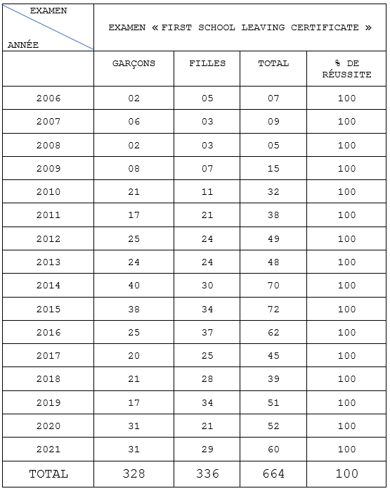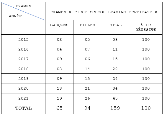 1- NCBS : Résultats à l’examen « First School Leaving Certificate »