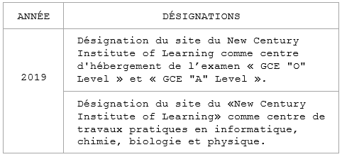 2- Désignation du site du « New Century Institute of Learning » par le « GCE Examination Board » comme centre d’examen